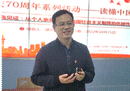 盛宏模老师从自己以及自己家庭在美国的亲身经历,对比了中美制度差异、文化差异和发展差异,更加证明了中国特色社会主义制度的优越性,更进一步凸显了中国共产党领导和中国特色社会主义制度的显著优势。最后,盛老师对大家寄予殷切希望,处于新时代的青年,应当更加奋发图强,居安思危,努力迸发更大的青春活力,为建成社会主义现代化强国而努力奋斗。