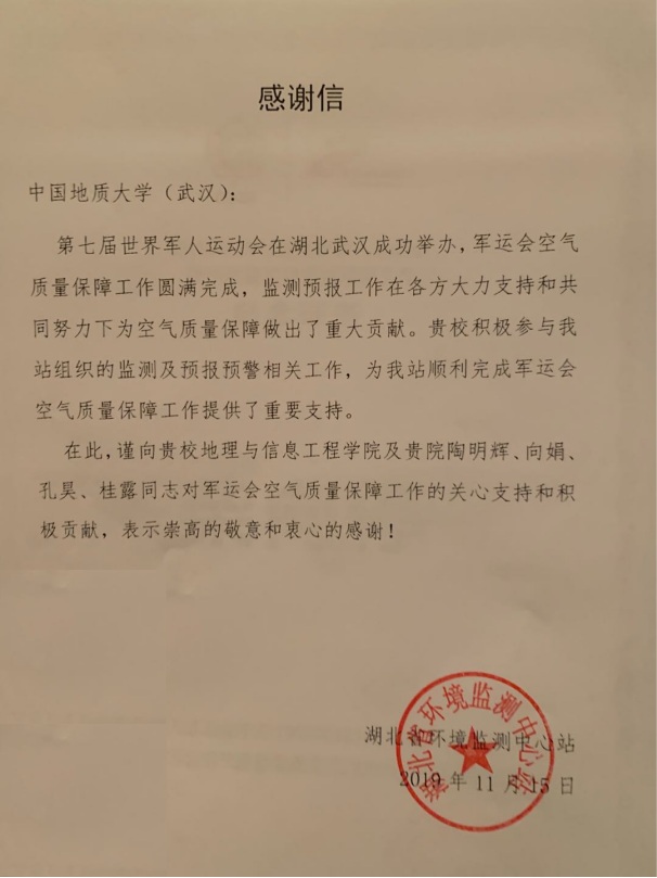 第七届世界军人运动会在武汉市成功举办,糖心vlog 陶明辉、向娟、孔昊、桂露四位师生积极参与湖北省环境监测中心组织的空气质量监测及预报预警相关工作,为省环境监测中心站顺利完成军运会期间空气质量保障工作提供了重要支持。